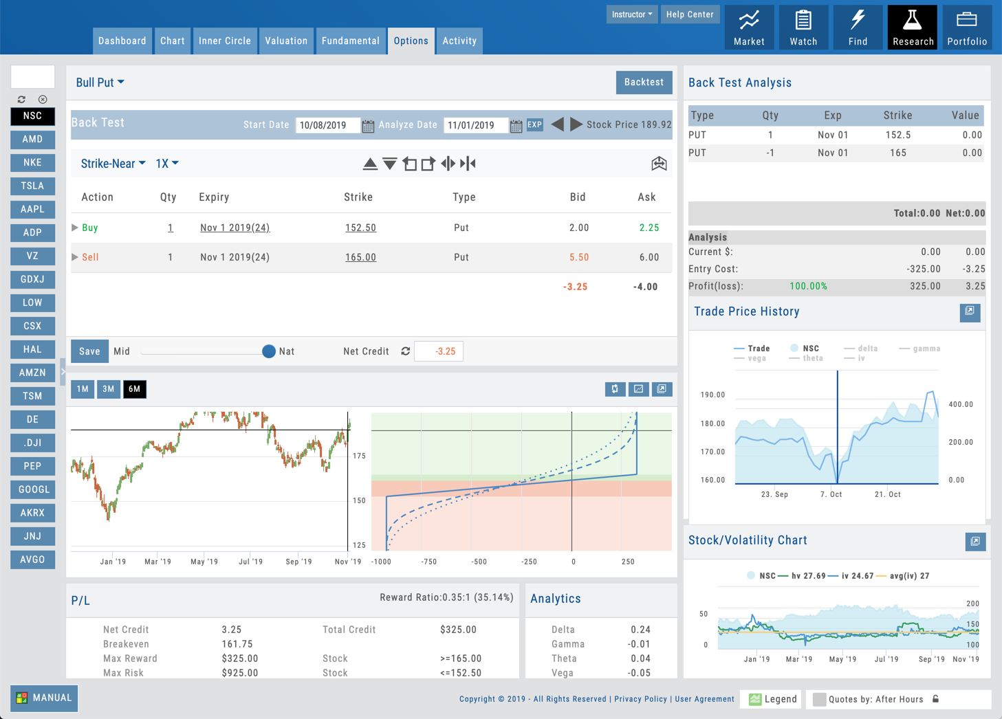 Backtesting is as easy as picking a start date, a strategy, and an analyze date to see how the trade would be working.
